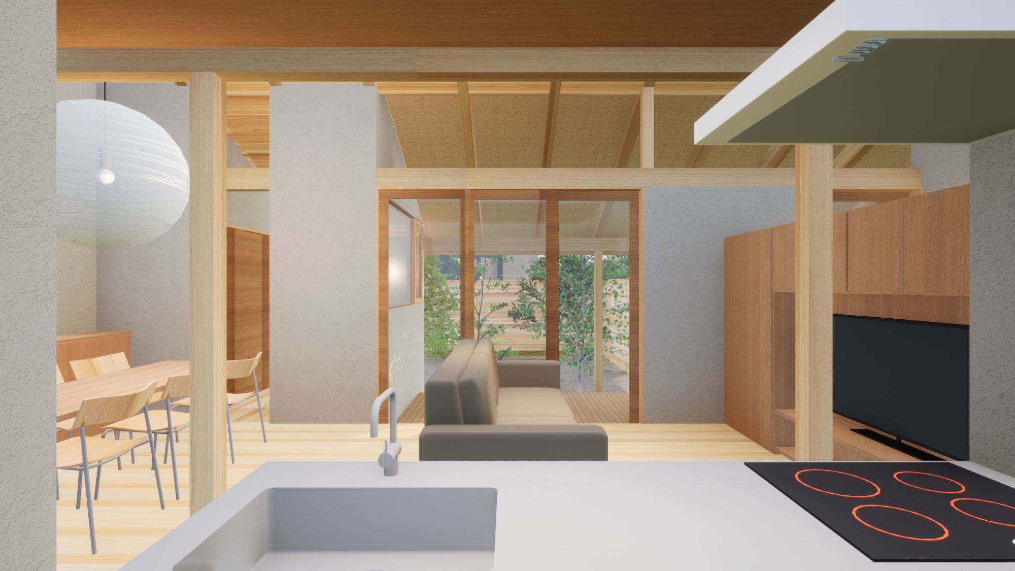 寝室や水廻り以外は開放的に一室として使えるよう計画し、自然の中で育った夫婦に寄り添う、のびやかで心地よい暮らしを提案しています。